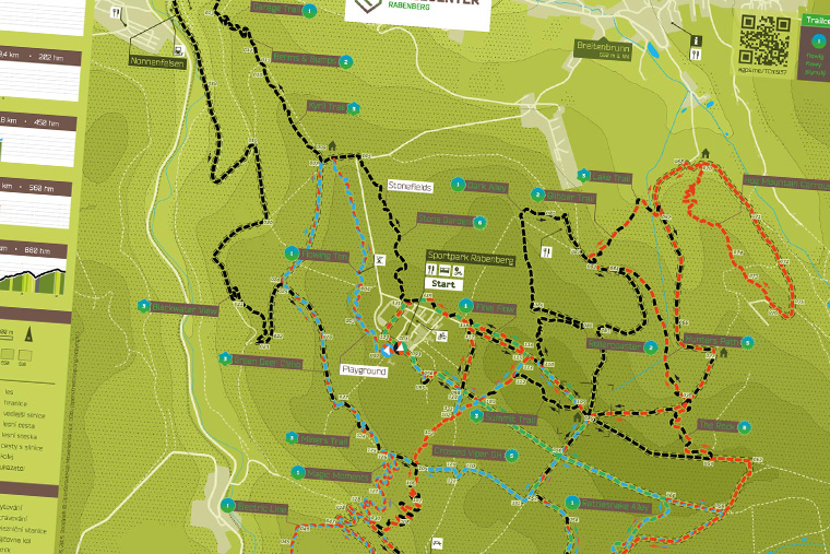 Das Trailcenter Rabenberg umfasst Wege mit einer Gesamtlänge von ca. 50 km. Davon sind ca. 50% Singletrails, die im Wesentlichen naturbelassen sind. Durch die Kombination von verschiedenen Teilstrecken in den unterschiedlichen Runden entsteht eine Gesamtstreckenlänge von 75 km. Zusätzliche Technik-Elemente wie Anlieger, Wellen, Kicker, North-Shores und natürliche Wurzelpassagen garantieren Abwechslung und Fahrspaß, von der Familie bis zum Enduro-Biker.